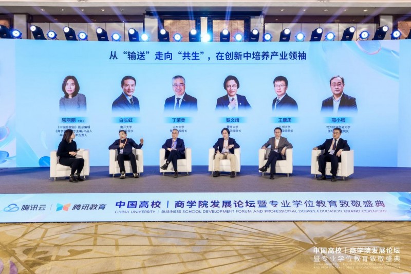 圆桌论坛——以“从‘输送’走向‘共生’,在创新中培养产业领袖”为主题,由《中国经营报》副总编辑、《商学院》杂志主编/出品人、中经传媒智库负责人屈丽丽主持,南开大学商学院院长白长虹、山东大学管理学院院长丁荣贵、暨南大学管理学院院长黎文靖、兰州大学管理学院院长王康周、对外经济贸易大学国际商学院院长邢小强,围绕商科教育创新、技术赋能与产业协同,分享了各自在相关领域的最新探索与思考。