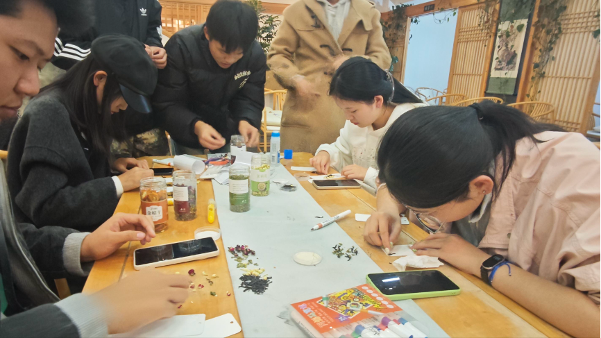 系列活动压轴的 “一叶知诗・茗香留痕” 书签制作,让传统文化体验更具情感温度。基地创作区里,学生发挥想象,从基地提供的茶叶、干花、叶片中选材,在书签底板上构图,或配古典诗词,或写心灵寄语,将对茶文化的理解与生活感悟凝注于方寸间。这些手作艺术品既展现学生美育能力,更成为情绪疏导、心灵沉淀的载体,帮助学业繁忙的学生慢下来,感受手作疗愈温度。