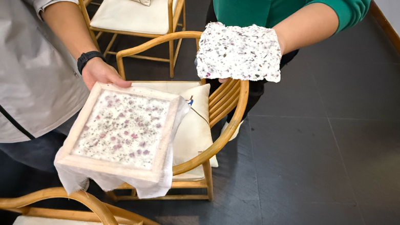 依托研习成果,“茶文化手工纸 DIY” 实现理论与实践衔接。基地内,专业老师与工作室成员示范指导,带领学生将茶产业废弃茶渣 “变废为宝”,经打浆、抄纸、压制、晾晒等传统造纸工序,转化为散发茶香的手工纸。过程中,学生既体验传统造纸技艺精妙,践行循环环保理念,更融入化工专业材料特性、可持续知识,实现专业能力与劳动实践协同提升。