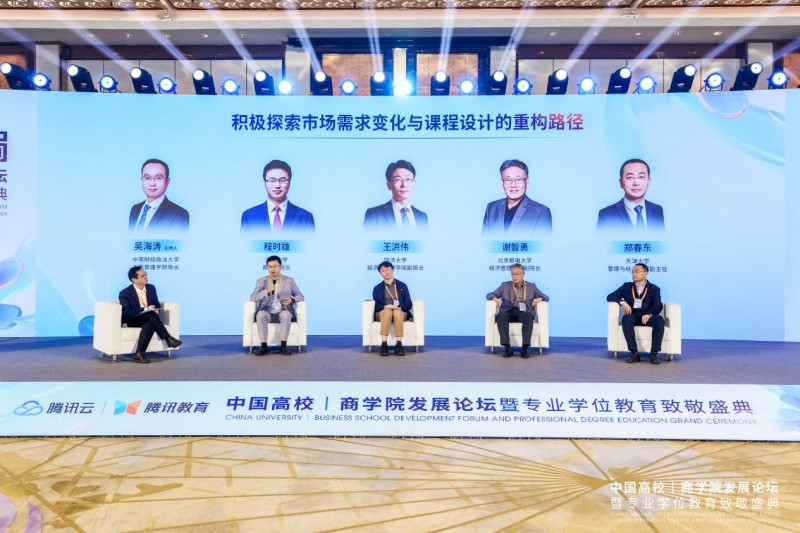 圆桌论坛——以“积极探索市场需求变化与课程设计的重构路径”为主题,由中南财经政法大学工商管理学院院长吴海涛主持,湖北大学商学院院长程时雄、同济大学经济与管理学院副院长王洪伟、北京邮电大学经济管理学院副院长谢智勇、天津大学管理与经济学部副主任郑春东展开深入探讨并分享了各自的见解。